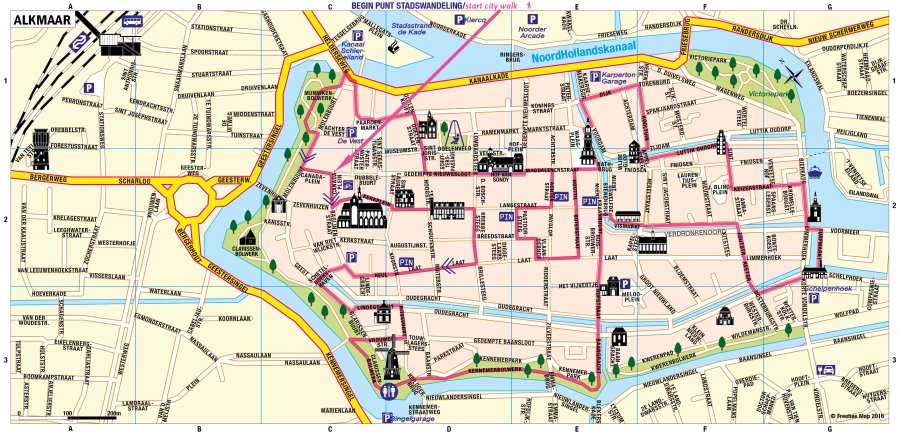 U begint op het Canadaplein, vernoemd naar de bevrijding door de Canadezen in 1945. U loopt langs de Grote Sint Laurenskerk, het grootste kerkgebouw van Alkmaar.U keert de Langestraat in en ziet Huize Egmont dit werd in 1741 gebouwd voor Carel de Dieu. Nu een heren sociëteit U vervolgt uw route door de grootste winkelstraat van Alkmaar, hier vindt u het oude Stadhuis dat na 11 jaar bouwen in 1520 voltooid werd U loopt over de 2e grootste winkelstraat van Alkmaar naar de oude volkshuisjes op het Bolwerk. Voorbij de gracht komt u langs het Hofje van Splinter , dat meer dan 350 jaar oud is. Neem ook eens een kijkje in de winkel van Strips & Zo (24) Hier vindt u een groot assortiment aan stripboeken. In de Vrouwenstraat, een oud prostitutie straatje, vindt u Damars Wijnshop (41) Met overheerlijke wijnen en delicatesse. Vervolg de route en u komt langs de Molen van Piet. U loopt over het bolwerk van Alkmaar, een heerlijke groene zone aan de rand van het water. Aan de Hofstraat ziet u De Baptistenkerk . als u bij de Huigbrouwerstraat bent, vindt u nog de “ouderwetse winkel van J.Boom” (25) Via de Vismarkt ,waar vroeger de vis rechtstreeks per boot werd aangevoerd, nu kan u aan deze visbanken lekker eten bij Restaurant de Buren (1) nu bent u op de Platte Stenenbrug en loopt u langs het water op het Verdronkenoord richting het Noord-Hollands Kanaal kijk even bij het oude gebouw van de Zoutziederij. U heeft een mooi uitzicht over de haven op het terras van Restaurant de Turfmarkt (21) ziet u ook de in 1622 gebouwde Accijnstoren, hier werd de in- en uitvoer van goederen over water in de gaten gehouden. Vervolg uw Route langs het water en sla linksaf de Keizerstraat in. Iets verder staat De Vigilantie (De Waakzaamheid) dit is een pakhuis dat in de tweede helft van de 17e eeuw werd gebouwd. U komt bij het Huis met de Kogel waar nog een Spaanse kanonskogel in het huis zichtbaar is. Nog steeds vieren wij de overwinning op de Spanjaarden elk jaar op 8 oktober. Vervolg u weg over de brug en loop de kooltuin in. Sla links af naar de Dijk en hier komt u langs Pitta Irodion ( 42), Geniet hier vaneen heerlijk Grieks broodje. Vervolg u weg en u loopt langs het Waagplein met de Alkmaars trots, De Waagtoren. Bezoek de “kaasexperience van AlkmaarsGoud” (14) waar de rijke geschiedenis wordt verteld van de beroemde Alkmaarse Kaarsmarkt. U vervolgt uw route via Houttil en richting de Boterstraat, waar u eigentijdse winkeltjes vind. Bij Stadsbrasserie Elhorst (26) op de Laat kunt u heerlijk genieten van lekkere kop koffie en een Alkmaarse bol , al 61 jaar een begrip in Alkmaar Vervolg de route richting de Paardenmarkt. Door het Bolwerk loopt u terug naar het Canadaplein.